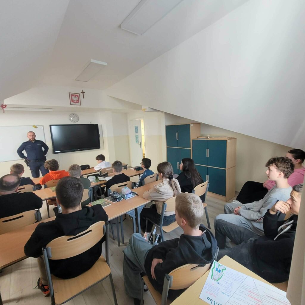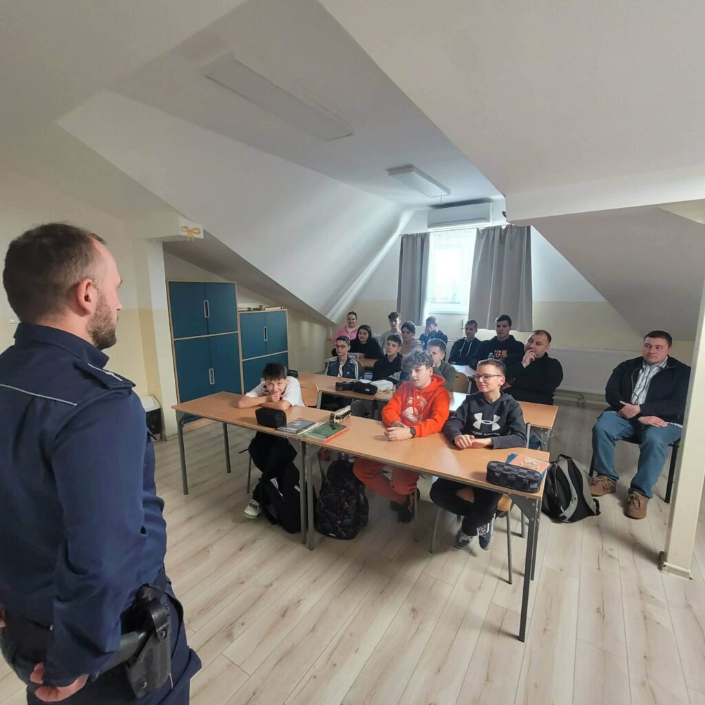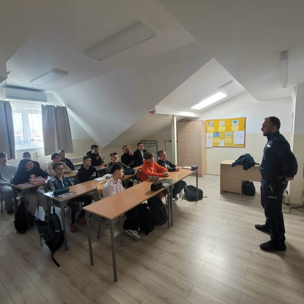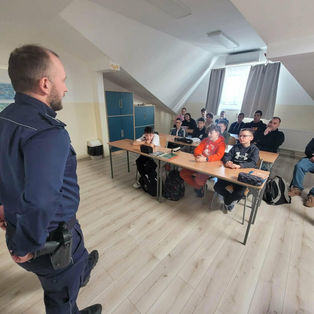 Podczas spotkania policjant wyjaśnił, kim w świetle obowiązujących przepisów jest osoba nieletnia oraz jakie konsekwencje prawne mogą ponosić młodzi ludzie za swoje zachowanie. Omówił najczęstsze przejawy demoralizacji, odpowiedzialność za czyny karalne, a także zasady bezpieczeństwa w szkole, w domu i w Internecie.